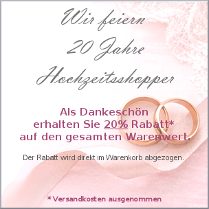 In unserem online Shop findest Du pure Romantik und eine sehr große Vielfalt für den schönsten Tag im Leben. Neben traumhafter Dekoration, einzigartigen Geschenkideen, Dekobändern und vielem mehr bieten wir Dir hier raffinierte Styling-Ideen und exklusive Trends. Mit unserer Vielfalt wird Deine Hochzeit auch für die Gäste ein atemberaubendes Erlebnis. Stöbere gleich in unserer exklusiven Romantik und entdecke faszinierende Produkte. Wir haben unseren Shop für Dich gut sortiert, sodass die einzelnen Kategorien Dir den Weg zur Traumhochzeit erleichtern.
