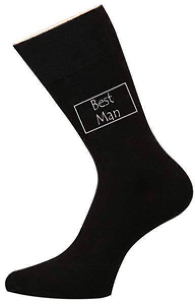 Die Strümpfe sind schwarz und tragen in weißer Farbe die Aufschrift „Best Man“.