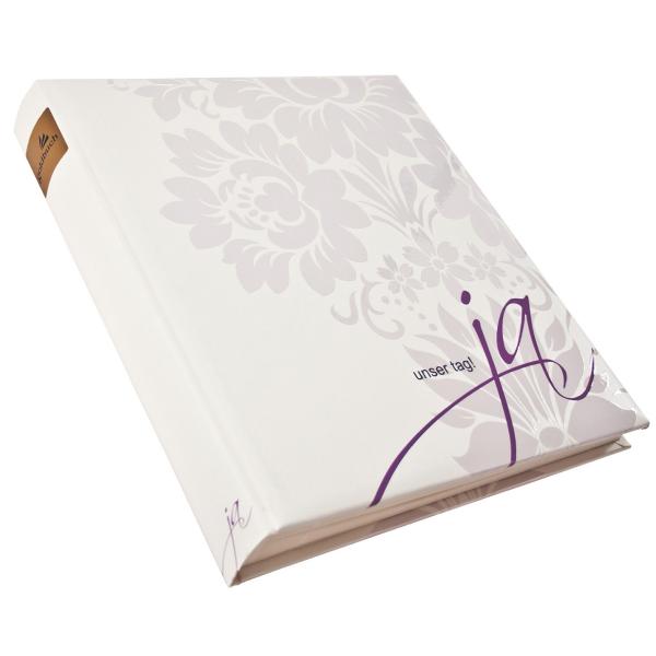Unser Hochzeitsalbum ist in weiß gehalten mit der Aufschrift "unser Tag! Ja" und Blumenmotiv.